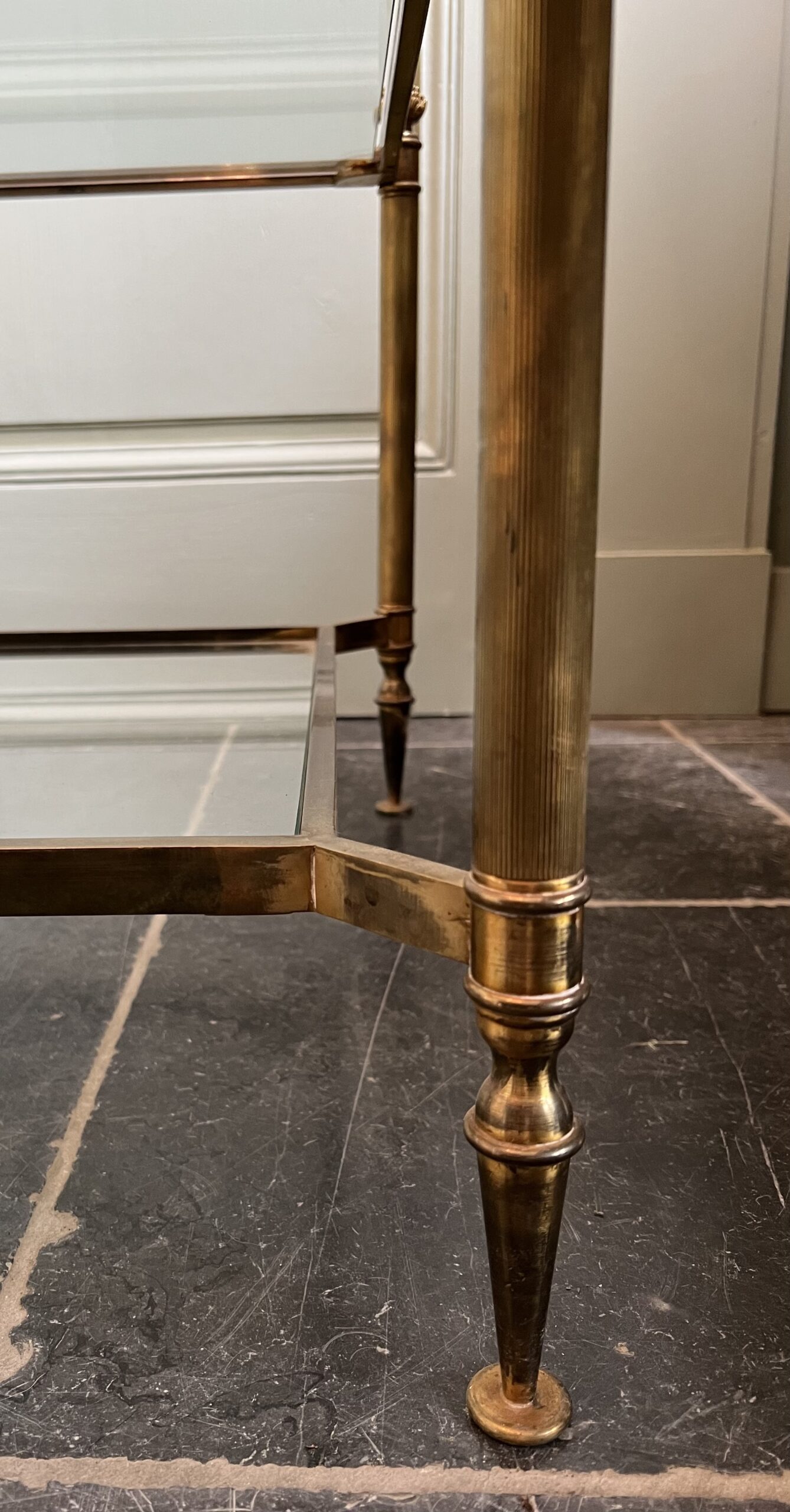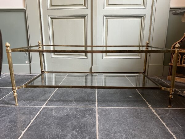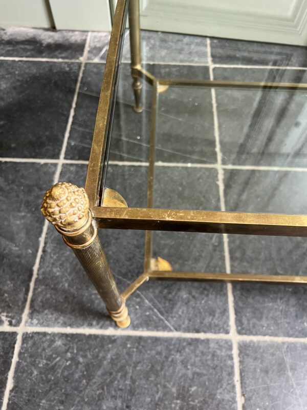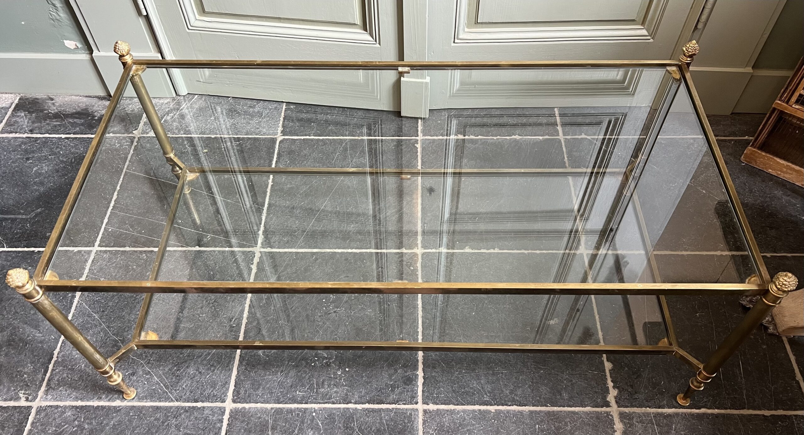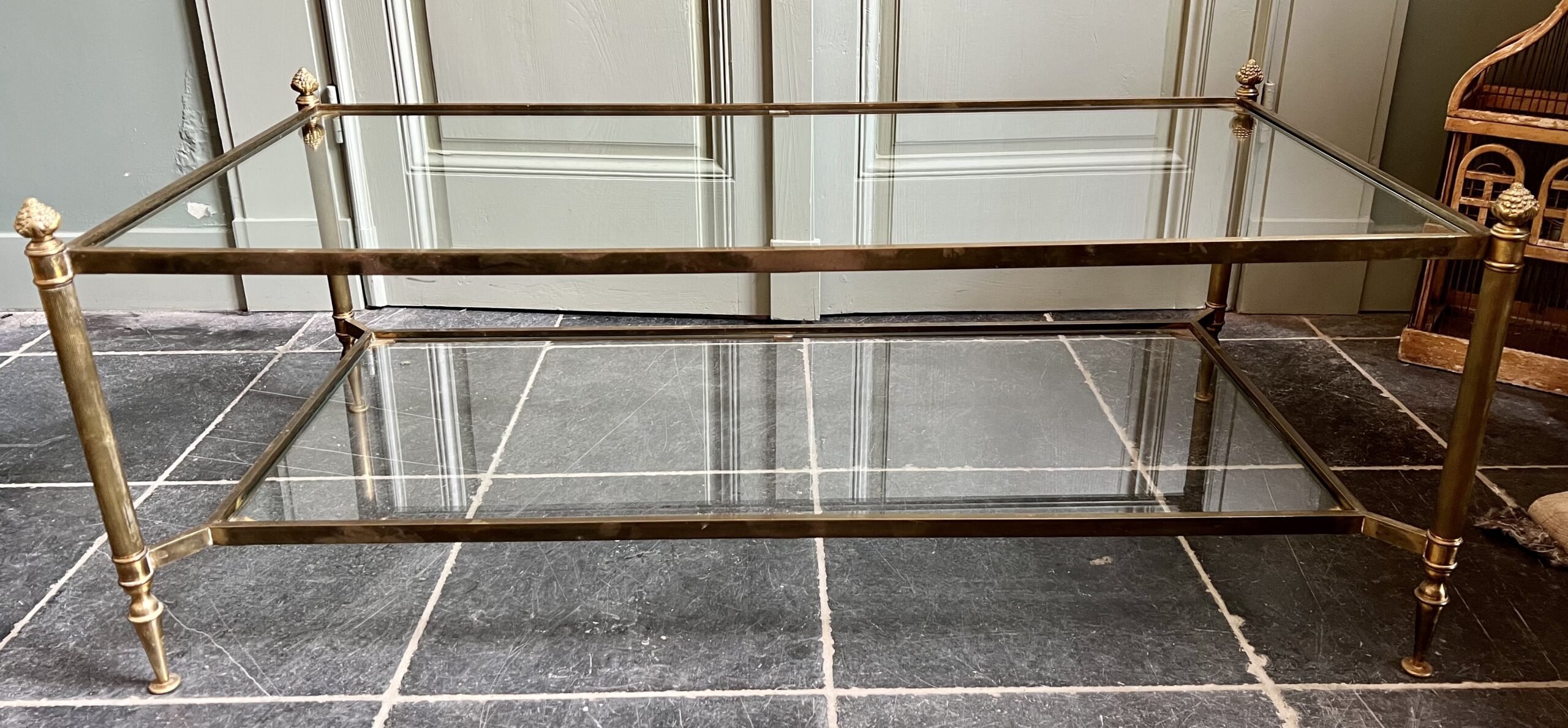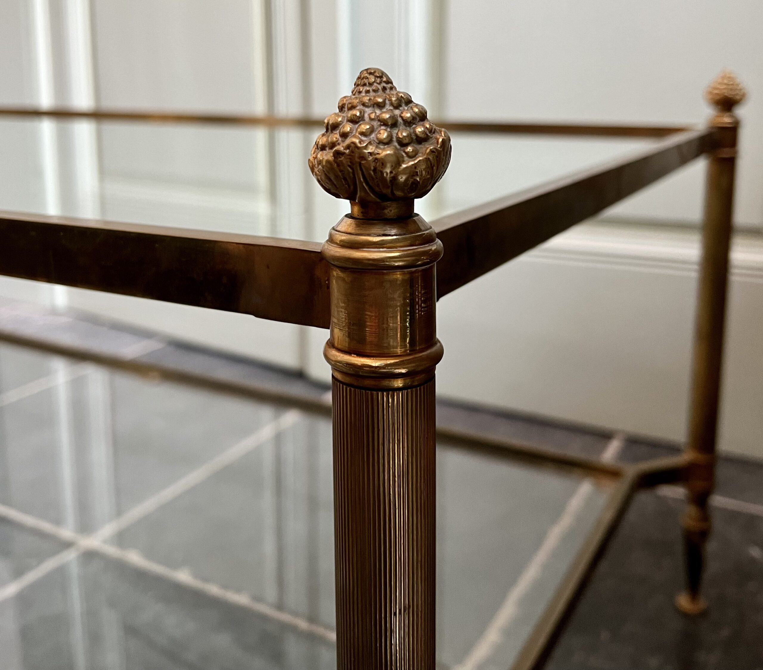 Large rectangular coffee table with two superimposed levels in the style of Maison Jansen from ca. 1970. Tapered legs with fluted uprights topped with pine cones, made of brass.