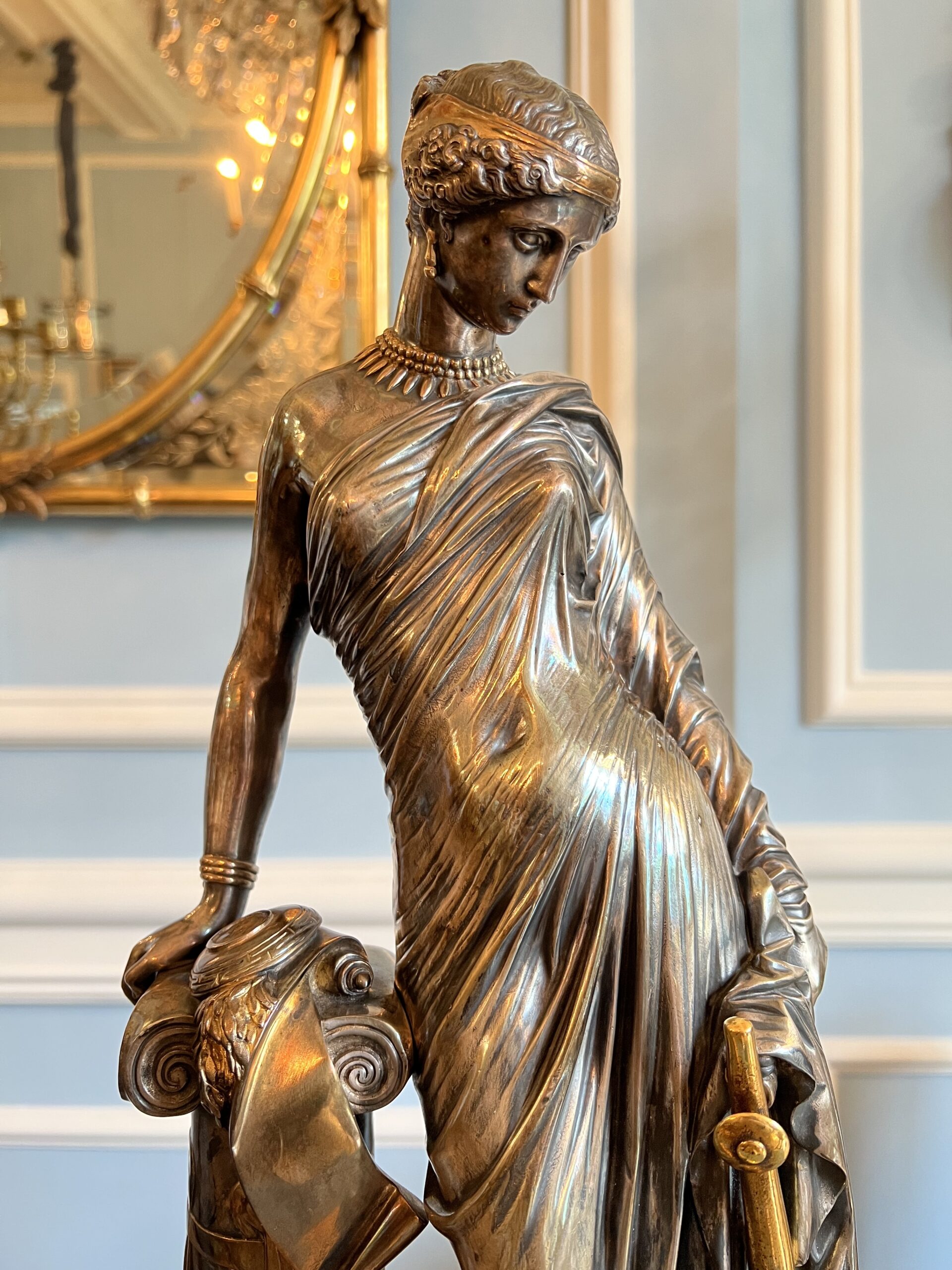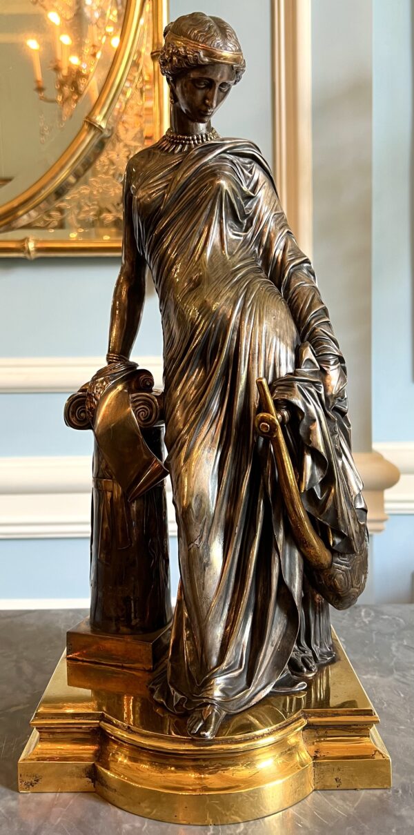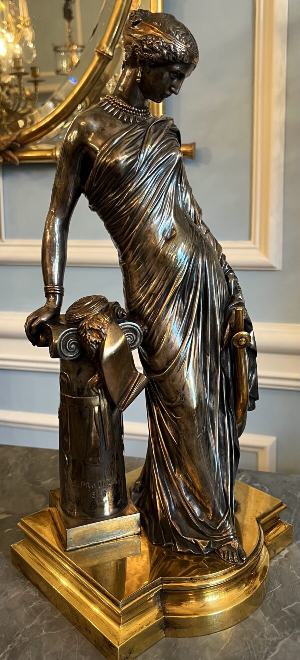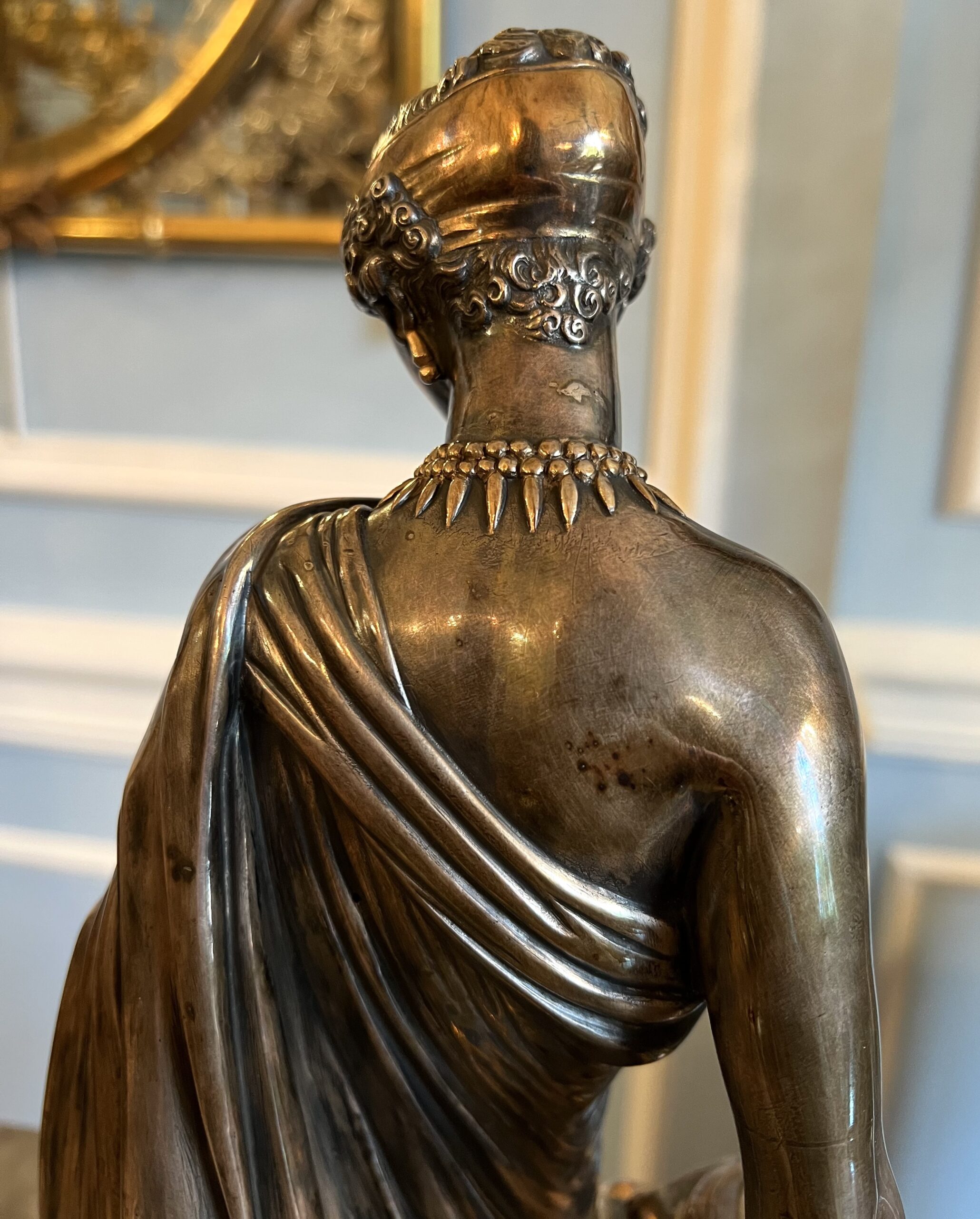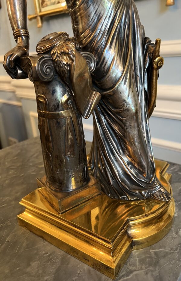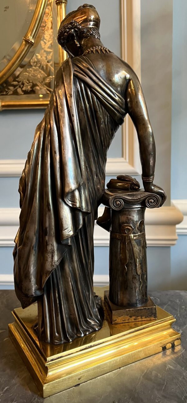 Sculpture in gilded and silvered bronze signed “J. Pradier” and dated “1848”. Bears the foundry stamp VP with crown for Victor Paillard. “Sappho at the Column” was first presented in 1848 at the Paris Salon.